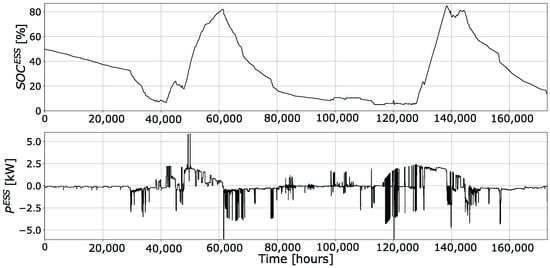 The MPC has been already proposed in this field, as it naturally handles multivariable control and the presence of constraints, both typical features of EMS problems. In [], a switched MPC control strategy is presented for the energy management of a standalone system composed of a PV module, a diesel generator, and a battery bank. Charging and discharging efficiency factors are estimated online (the same technique could be adopted in this work), while the switching between charging and discharging is decided based on a heuristic. The aim is to: (1) minimize the usage of the diesel generator; (2) maximize the usage of PV power; and (3) minimize battery activation. The included constraints are on the energy flows, on the ESS state of charge (SOC), and mutually exclusive charging/discharging activation. In the present work, some of the assumptions made in [] are removed, namely, the assumptions on rigid loads (in [] loads’ starting times are not managed) and fixed charging/discharging switching times. Also, an economic term is included here in the target function to minimize the bill.