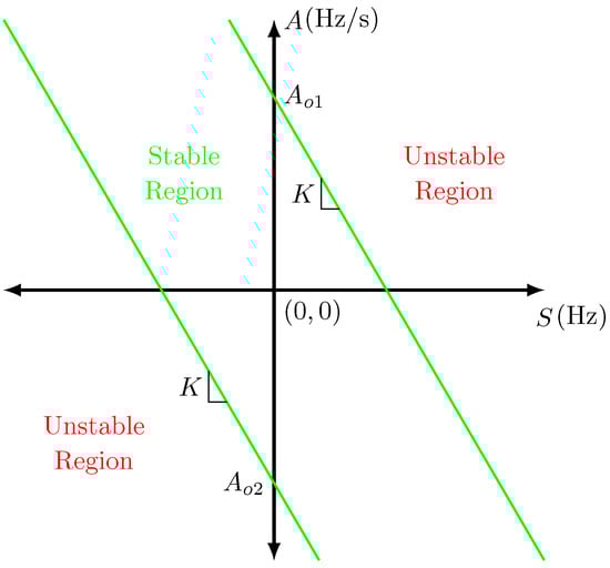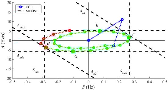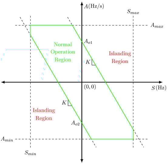 In this work, the OOST algorithm explained in Section 3 was modified and accordingly combined with the angle difference scheme to propose an improved active splitting scheme (ASS) especially suitable for LPS. Since phase angles in a LPS may change drastically even when small changes in active power occur (see Section 2 for details), it seems appropriate to further limit the normal operation region shown in Figure 1. To do this, upper and lower boundaries for the slip frequency and acceleration in the plane are included, as shown in Figure 2. These boundaries use Equations (9) and (10) to detect an unstable operating point.