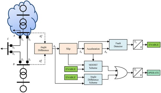 When either Equation (11) or (12) is fulfilled for a time , the MOOST and angle difference elements begin to check the current operating region of the system based on the limits defined in Figure 2 and Equation (4), respectively. If at least one of the conditions established in Equations (4), and (7)–(10) is satisfied for a predefined time , an unstable condition has been detected and the ASS starts to operate. Otherwise, the ASS remains blocked. In the illustrative network shown in Figure 3, the line switches and in the bus A are opened if the scheme operates.
