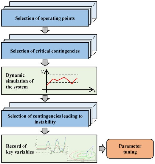 As usual in OOST and angle difference elements, the parameters of the control scheme must be set according to the technical characteristics of each power system. This process must be performed based on detailed dynamic models of the system under study and considering a wide set of scenarios. Figure 4 shows the proposed block diagram of the methodology for tuning the parameters needed in the proposed ASS.