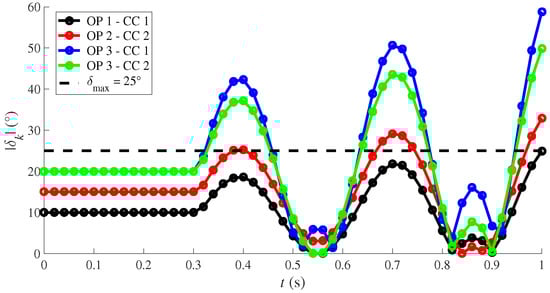 Figure 5 and Table 2 show illustratively how the angle difference scheme tuning is carried out. In this example, two critical contingencies (CC) leading the system towards its collapse are analyzed considering three different operating points. Figure 5 depicts how the absolute difference angle (see Equation (3)) evolves between two buses of the system and Table 2 shows the initial angle and for each OP and CC. In these cases, the disturbance occurs at , and depending on the OP and contingency, the system could reach a point in which it is no longer able to maintain its stability. This point is represented as in Table 2. Considering Equation (13) and the values shown in Table 2, the maximum angular difference threshold is defined as .