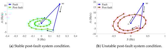 To establish the parameters for the MOOST scheme it is necessary to identify three key points of the trajectories during a contingency: (1) steady state condition; (2) fault condition; and (3) post-fault condition. Figure 6 illustrates this process for an (a) stable and (b) unstable post-fault system condition. The initial point of the blue trajectory, points O in Figure 6, represents the steady state condition (stable). Once the fault is applied, the trajectory moves towards a maximum value indicated as in Figure 6. When the fault is cleared, the trajectory moves to point C. If the system is stable, the trajectory will finally converge into the origin during the post-fault condition as shown in Figure 6a. Otherwise, the trajectory will follow a divergent spiral trajectory from the origin, indicating an unstable condition Figure 6b.
