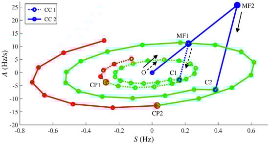 During unstable post-fault conditions, there is a point (critical point ) from which the system is no longer able to maintain its stability if no extreme corrective actions are taken. At this point, system blackout is imminent, and the MOOST scheme should operate to separate the affected areas aiming to avoid the total system collapse. To illustrate this point, let consider the two trajectories (representing the system evolution) for two different contingencies shown in Figure 7. Dashed and solid arrows indicate the trajectory followed by the system in the first and the second contingency, respectively. In this example, both trajectories are divided into three parts. The blue section of the trajectories represents the evolution of the system during the fault; with a maximum value (during the fault) highlighted as and . The green section of the trajectories starts with the fault clearance ( and in Figure 7). These points are characterized by a network condition in which the system could still sustain its stability if sound remedial actions are taken. Finally, the red sections start at the critical points and from which the system collapse is imminent.