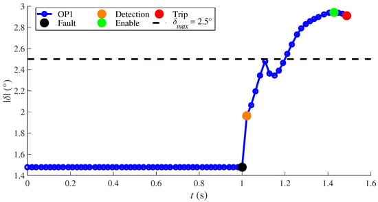 Table 6 summarizes the operation of each element of the proposed ASS. As can be seen, the fault detector element detects the contingency for all OPs, allowing the activation of the angle difference and the MOOST element. While both schemes triggered at the same time for the operating point OP1, the MOOST element triggered at the first place for OP2 and OP3. Moreover, the MOOST element was activated due to the satisfaction of the new restrictions (Equations (9) and (10)), allowing to detect the unstable operating point before the trajectory leaves the stable region through the boundaries defined in Equations (7) and (8). Therefore, with the proposed scheme, it is possible to take faster remedial actions than with a traditional OOST element (Equations (7) and (8)), gaining valuable time at the moment of the splitting.