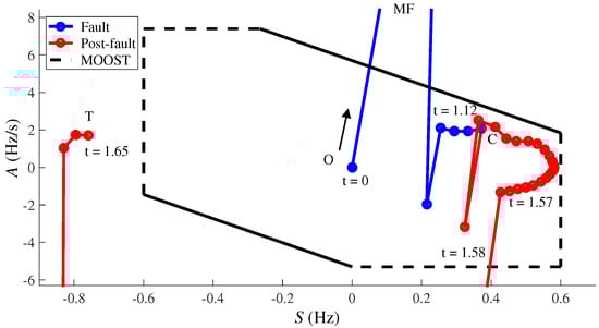 Figure 12 shows the trajectory in the plane for the OP2. The trajectory starts around the origin (point O) which represent the steady state condition before the fault appliance (). The fault condition is represented as a blue trajectory on the figure. After the fault is cleared (point C) and the post-fault trajectory (red line in the figure), remains inside the MOOST region for . At , the trajectory leaves the stable region in the plane, thus triggering the MOOST element due to boundary. The element trips when the timer is satisfied (point T), allowing the splitting of Chiloé Island from the CIS.