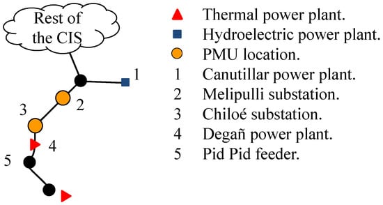 The simulations were based on the CIS of Chile. In order to illustrate the structure of the network, a simplified diagram is shown in Figure 10. The CIS is a good example of extreme LPS; it has long transmission lines covering a total length of near 2300 km. The CIS supplies a peak load of 7300 MW with the major load located in Santiago, Chile’s capital, placed in the central part of the system and encompassing around one third of the country’s population. The system is mainly composed by thermal and hydroelectric power stations. Hydroelectric power plants are mostly concentrated in the south of the CIS comprising near the 50% of the whole installed capacity. Due to the structure of the CIS, different areas may be adequate to evaluate the performance of the proposed scheme. According to Chilean TSOs experience, one area which could be saved when a blackout in the system is imminent is Chiloé Island. The island is located at the end of the CIS and is interconnected by a single 220 kV line. The zone to be split and the PMUs location are shown in Figure 10. Although from a topology perspective the Chilean network may be categorized as a simple problem, this system is especially interesting from a stability perspective due to its extreme longitudinal structure and characteristics. Indeed, several works confirm that the Chilean system is prone to face stability problems in cases in which meshed networks would not [,].