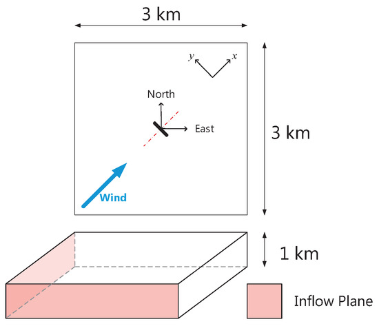 We generate the desired inflow field by first performing a precursor atmospheric LES. The computational domain size must be large enough to capture the largest important scales of interest. For neutral atmospheric stability, these largest important scales are on the order of a few kilometers. Accordingly, we use a domain extending 3 km in both horizontal directions and 1 km in the vertical direction (Figure 1). A uniform grid resolution of 10 m is used in each direction, resulting in a precursor mesh containing cells. We use periodic lateral boundary conditions; additionally, a driving pressure gradient body force term is applied such that a target horizontally-averaged velocity at a specified height is achieved. In the case discussed in this study, we drive the flow (with the wind out of the southwest) so as to achieve a velocity of around 8 m/s at a height of 80 m above the surface since we use a turbine with a hub height of 80 m for the wake generation. The mean wind speed of the generated field at that height is 8.12 m/s. The upper boundary of the domain is treated as a rigid stress-free lid while the lower surface is modeled as a flat rough wall. A wall shear stress boundary condition that uses the Monin-Obuhkov scaling law is applied at the lower surface (a no-slip condition would not be appropriate unless individual roughness elements are resolved, which is impossible with LES at such high Reynolds number and the current state of computing power).