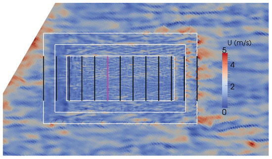 In contrast with the uniform mesh used for the precursor simulation, the mesh around the turbine is refined for the wake simulation to describe the interaction between the flow and the actuator line more accurately. Figure 2 shows a horizontal plane through the free-stream flow field that is taken near the surface ( m). Note that the computational grid is rotated because, in the simulation, the flow comes from an angle (out of the southwest); the plot is rotated as if the flow direction is from left to right. The magenta line shows the location of the wake-generating turbine, which is not simulated in this case. The white rectangles indicate outlines of the successively refined subdomains. The size of the cells located outside the largest subdomain is 10 m, the same as that of the precursor simulation; the size of cells at the innermost computational subdomain is 1.25 m (). The black lines shown are spaced one rotor diameter (D) apart from one another and from the magenta line. Total number of grid points are approximately 35 million.