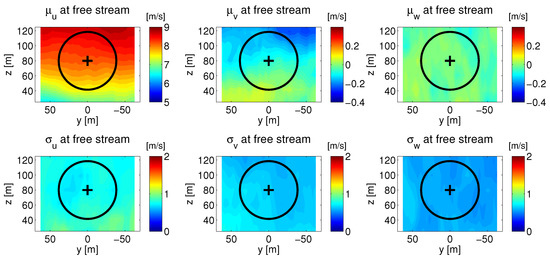 We discuss stochastic characteristics of the free-stream field, which represents the inflow field for the wake-generating turbine. The duration and sampling rate for the simulated free-stream time series studied are 600 s and 3.125 Hz, respectively. Figure 3 shows the variation in a vertical plane of the mean () and standard deviation () of the along-wind (), across-wind (), and vertical () wind velocity components at of the precursor domain (where the wake-generating turbine is to be located). The circles shown indicate where the turbine rotor is to be located for the wake simulation. In the figure, is seen to follow a vertical profile that is reasonable for neutral stability conditions. In addition, the component profile has a zero-mean, near-homogeneous spatial structure. The turbulence () plots suggest slight vertical variation for all three components, k. These mean and standard deviation profiles are all reasonable and suggest that the target atmospheric conditions are well described in the computational domain for the precursor.
