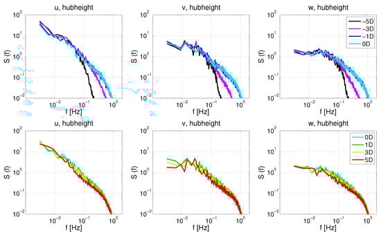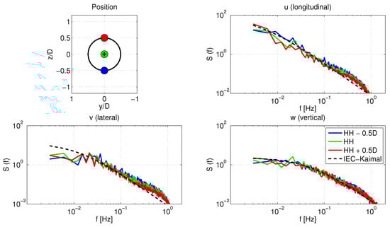 Figure 11 shows power spectral density (PSD) functions for the streamwise u component at different lateral and vertical locations around the rotor hub in the free stream () and in the wake (x = 5D, 7D, and 10D). The thin gray lines indicate the free-stream PSD; the various downstream locations in the wake are indicated by different line patterns. A different color is used for the separate lateral or vertical location for which the PSD function is computed. An increase in overall energy (higher PSD values) is seen around the top, left, and right edges of the rotor. These increases are most evident in a frequency band between 0.02 and 0.20 Hz. The elevated levels at the same locations around the rotor that were seen in Figure 10 may be explained by the increased energy in the PSD functions over a range of frequencies. The decay of these wake-induced increased energy levels as the flow moves downstream is different at the different positions around the rotor; the PSD for the top edge of the rotor shows a slower decay and return to free-stream levels than the PSD at the side edges.