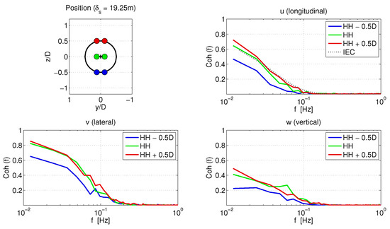 Figure 6 shows coherence functions for the three free-stream turbulence components with the same lateral separation at different elevations. The black dotted line for the longitudinal (u) component indicates an exponential coherence model used in a design standard [16]. Coherence functions for the v and w components, also discussed in a number of studies related to turbulence [19,20,21], are expectedly different from that for u. Coherence appears to depend on height; at lower heights, higher turbulence levels introduced by the lower boundary leads to weaker coherent in the wind field. The preceding observations related to statistical and spectral parameters all suggest that the simulated LES-generated free-stream wind field reflects characteristics of atmospheric turbulence satisfactorily.