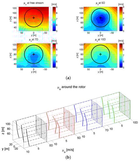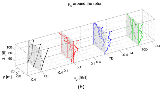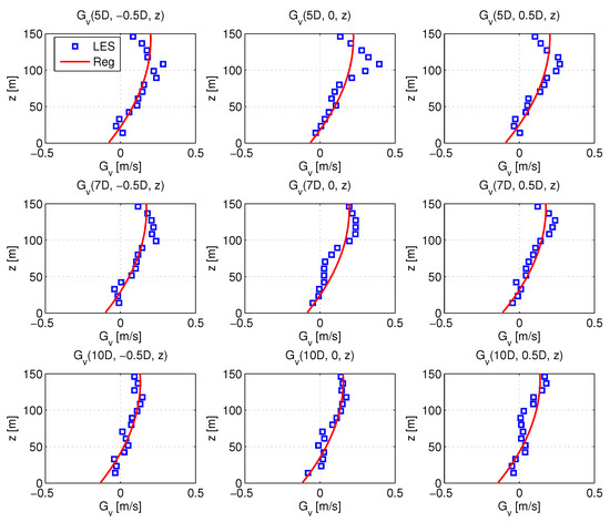 Figure 19 indicates that profiles have more lateral asymmetry than ; for instance, shows less vertical variation and influence of the rotating actuator line than does . The characteristics of profile could be related with these results. The counterclockwise-rotating actuator line produces enhanced (positive) lateral wind velocity at the top and a reduced (negative) adjustment at the bottom of rotor, relative to free-stream mean field, . To the right side of the rotor, shows relatively higher gradients than to the left side, which explains the differences between and . Our regression model captures these different vertical gradients between and ; however, the model has some limitations in capturing more complex nonlinearities at .