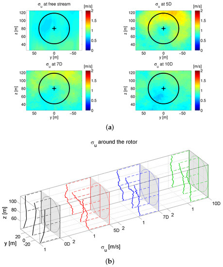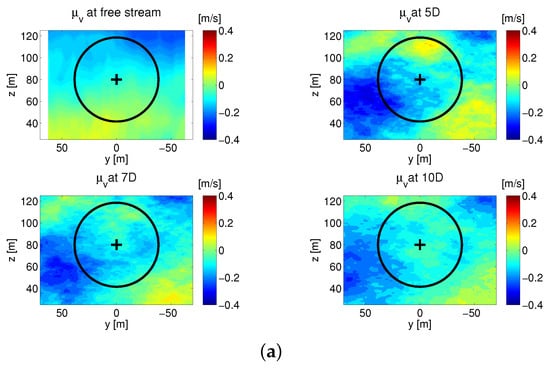 Figure 10 describes the spatial variation of in the free stream and at different downwind locations in the wake. It can be seen that is not uniformly distributed around the rotor. Higher standard deviation levels are seen around the top of the rotor, which were also reported in the study by Troldborg et al. [22]. An asymmetric pattern of the wake field is also evident.