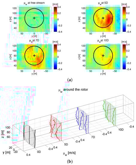 In Figure 9, a vertical motion is shown, due to the rotation of the actuator particularly on the right and toward the lower part of the rotor-swept area. These updrafts are absent in the precursor (free stream). The updraft might be the result of the wake’s meandering behavior [7,23]. In both Figure 8 and Figure 9, the mean wind profiles are not symmetric about the z axis due to the rotation of the wake. Although both the v and w components have small mean values compared to the mean value of the streamwise u component, these asymmetric characteristics need to be embedded in any stochastic wake model that is developed.