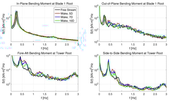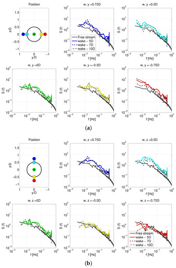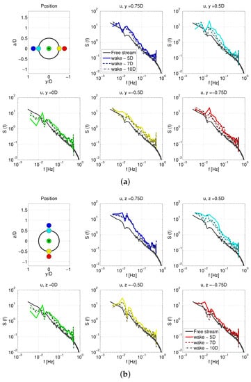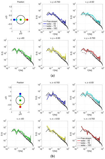 Figure 12 shows PSD functions for the v component at different lateral and vertical locations around the rotor rub in the free stream () and in the wake (x = 5D, 7D, and 10D). In this figure, the PSD functions at the left and right sides are seen to be different; at the right side, there is greater energy over frequencies between 0.02 and 0.20 Hz compared to that at the left. This is consistent with the fact that in the wake is not symmetric about the rotor center. The figure shows that PSD functions at the top and bottom of the rotor show different frequency content in the PSD functions.