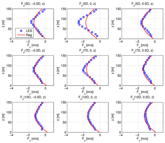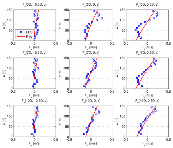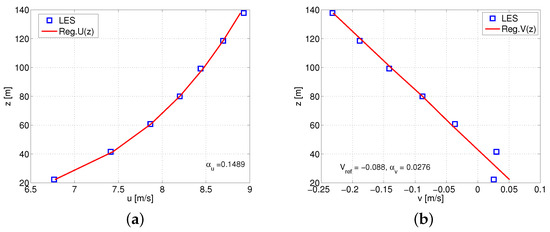 where denotes the free-stream parameters. In addition, is the free-stream mean streamwise wind velocity component variation with height, z, which is modeled using a power-law wind profile; and are reference height and the mean u component wind speed in the free stream at that reference height. In the present study, the reference height is selected as the hub height of the wind turbine considered. Similarly, is the free-stream mean cross-wind velocity component, which is also modeled using a reference wind speed, , but is assumed to vary linearly with z. Finally, is the free-stream mean vertical velocity component which is assumed to be uniform and equal to . With the above model, we can describe mean free-stream wind fields for the three velocity components using five parameters, . Table 1 and Figure 14 summarize results of regression-related estimation of these parameters based on the LES precursor data and an indication of the fit of the mean profiles for u and v using the estimated parameters.