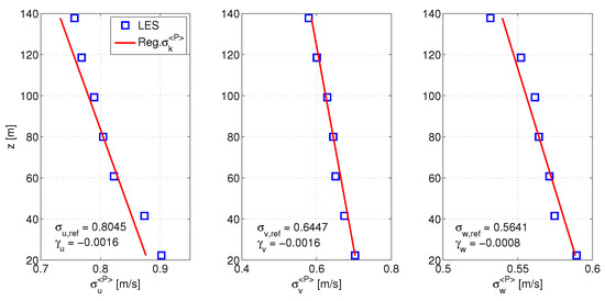 where is the k-component standard deviation at the reference height (which is the selected turbine’s hub height). The selected functional form is similar to that used for . Figure 15 and Table 2 summarize results of regression-related estimation of these parameters based on the LES precursor data and an indication of the fit of the standard deviation profiles for u, v, and w using the estimated parameters.