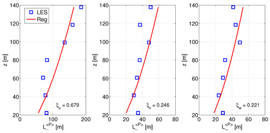 where and are the k-component integral length scale and the roughness length, respectively; In addition, the parameters are constant values, depending on k, that are based on the study by Solari and Piccardo [19]. Note that influences the variation of the PSD function with frequency. As m is assumed, we only need to estimate for each component. Table 3 and Figure 16 summarize results of regression-related estimation of the length scale parameters related to the PSD functions and an indication of the fit of the length scale profiles using the estimated parameters.
