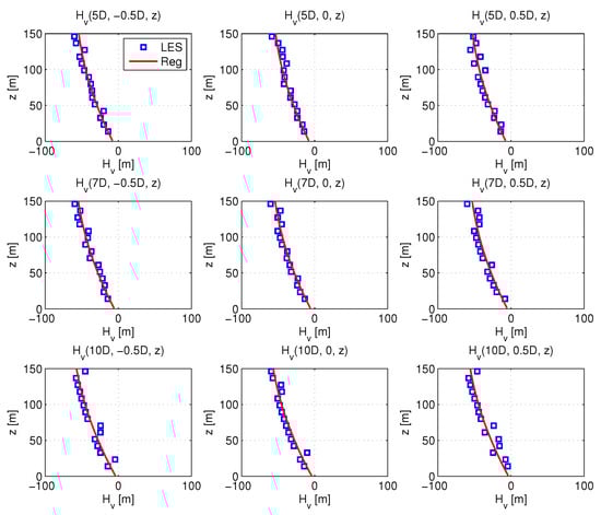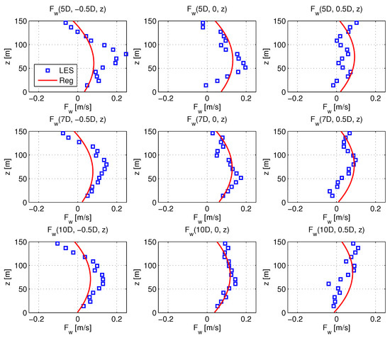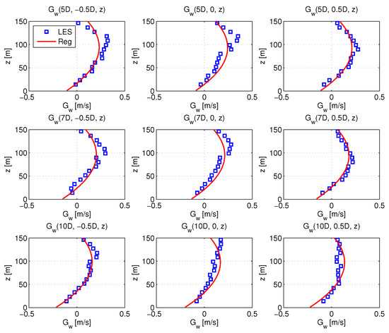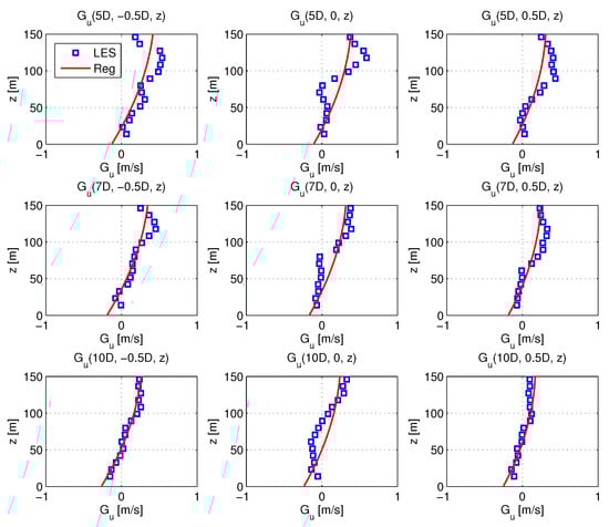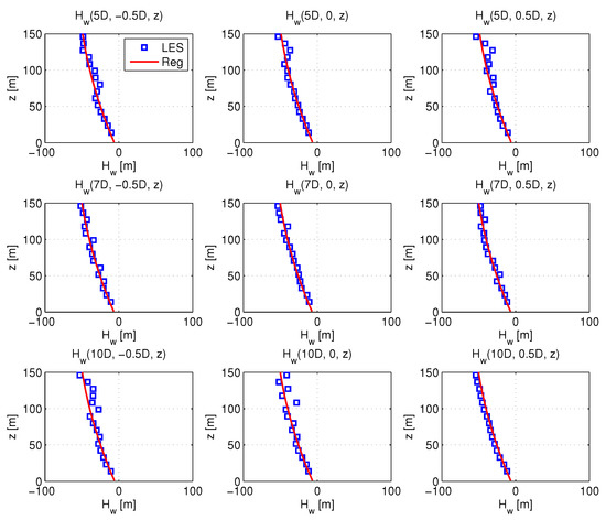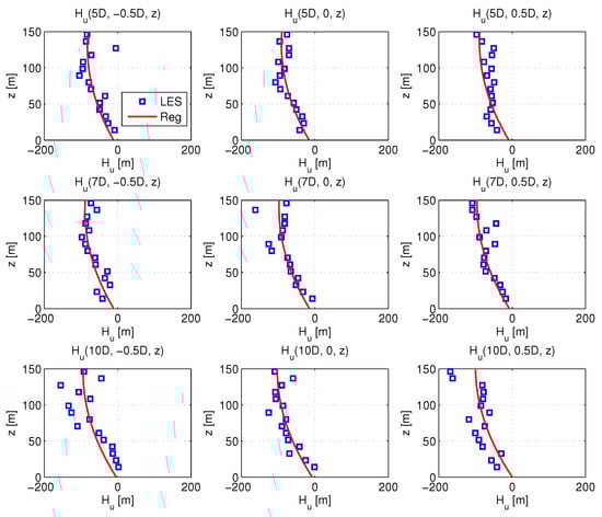 Results of the regression are presented in Table 4 and Table 5. The LES-generated mean wake field is used in the estimation of the regression model parameters. The vertical variation of , , and resulting from the regression are presented in Figure 18, Figure 19 and Figure 20 at downstream locations, , , and .