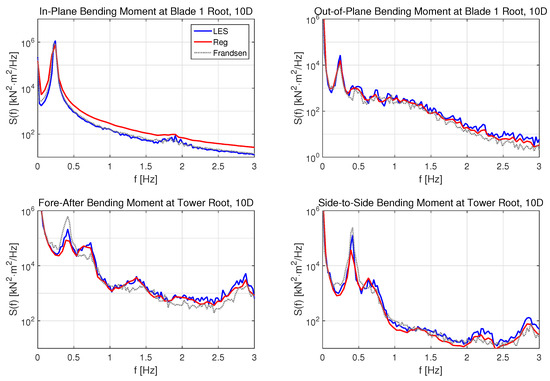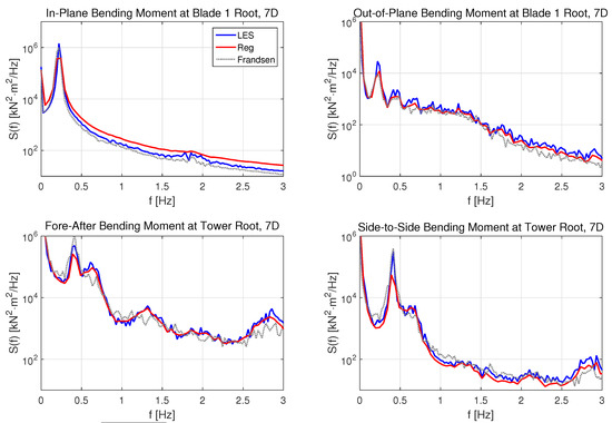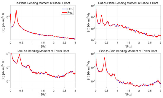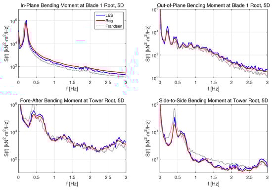 Power spectral density functions of turbine loads based on the stochastic wake model are presented in Figure 31, Figure 32 and Figure 33 for turbines in the wake at , , and , respectively. The turbine load PSD peaks from LES are reasonably well matched with those from the stochastic simulation. Compared to the Frandsen model, the stochastic simulation describes frequency-domain characteristics of the LES waked field better.