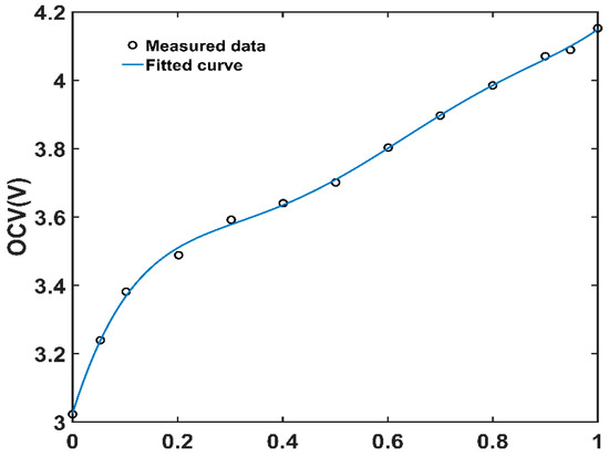 In Equation (9), the open-circuit voltage Uoc is taken as a given parameter, so in order to recursively update the battery model parameters through Equation (13), we need to determine the OCV-SOC equation first. In this study, a sequence of pulsed discharging experiments were implemented for the purpose of collecting the data used to determine the battery OCV-SOC curve. Based on the tested data, a fifth-order polynomial in Equation (14) is selected to characterize the dynamic variation of OCV with SOC, and the measured data and fitted curve are simultaneously presented in Figure 2. It can be seen that the fitted curve nearly goes across each tested data point, revealing that the selected fifth-order polynomial can characterize the variation of OCV with SOC very well.