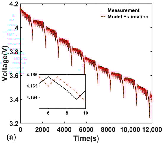 Result of terminal voltage prediction under New European Driving Cycle (NEDC) cycles: (a) Estimated terminal voltage versus measured data; (b) Estimated voltage error.