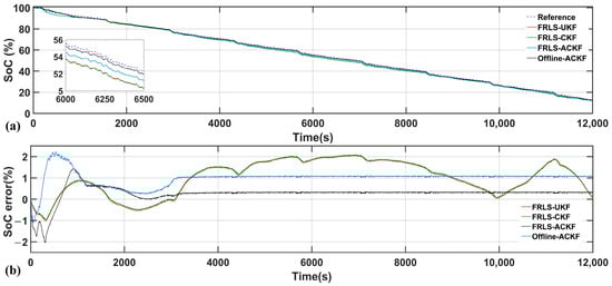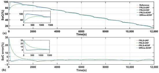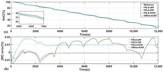 The SOC estimation results under the NEDC and FUDS cycles are respectively shown in Figure 8 and Figure 9, where the blue dashed-line represents the reference SOC calculated by the Coulomb counting methodology with accurately measured current values, the red solid-line reveals the estimated SOC using the UKF algorithm based on online parameter identification (FRLS-UKF), the green solid-line indicates the estimated SOC using the traditional CKF algorithm based on online parameter identification (FRLS-CKF), the black solid-line describes the estimated SOC using the adaptive CKF algorithm based on online parameter identification (FRLS-ACKF), and the blue solid-line represents the estimated SOC using the ACKF algorithm based on offline parameter identification (offline-ACKF). The maximum error and root mean square error (RMSE) of the SOC estimation with precise initial SOC values are summarized in Table 1.