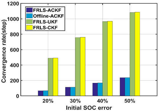 Convergence rate is another important indicator for evaluating the SOC estimation algorithm. Herein, the steps converged to 5% error bound at different initial SOC values from 50% to 80% with 10% steps under the NEDC and FUDS cycles are obtained to assess the convergence behavior of the ACKF algorithm as compared with the CKF and UKF algorithms. Figure 10 presents the comparison results. It can be seen that the convergence rate of the ACKF algorithm is more than five times as fast as the other two algorithms. Taking as an example, Figure 11 shows the SOC estimation results of the four algorithms in Figure 8 and Figure 9 with 70% initial SOC under the NEDC cycle. It is clear that the ACKF algorithm can quickly converge to the reference SOC values with different initial SOC errors compared with the UKF and CKF algorithms.