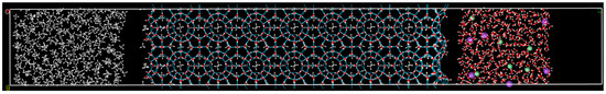 There are three phases in the simulation system. The solid phase consists of 2 × 2 × 8 unit cells of structure I crystalline hydrate filled with methane molecules of lattice size of 2.375 nm × 2.375 nm × 9.5 nm. The location of oxygen atoms in the sI hydrate lattice follows the single crystal X-ray analysis [53], and the hydrogen atoms were then added randomly and re-oriented to follow the Bernal-Fowler ice rule. The liquid phase that is in contact with the hydrate slab consists of 532 water molecules, 6 Na ions, and 6 Cl ions to reproduce the 3.5% salinity in the seawater environment. The gas phase in contact with the hydrate slab consists of 336 methane molecules. Simulation boxes of hydrate-water and hydrate-methane are arranged along z-dimension, respectively, such that the interfacial area is in the x-y plane. The total size of simulation cell is 2.375 nm × 2.375 nm × 18.3418 nm. A snapshot of our system shown in Figure 1.