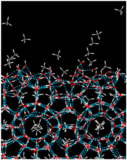 Molecular dynamics simulations (MD) is a powerful tool to study the microscopic structures and dynamics in condensed phases with little time resolutions, and yields a significant value of information, such as thermodynamic and equilibrium properties [19,20,21,22,23,24,25], thermal conductivity [26,27,28,29], nucleation [30,31,32,33,34], and growth [35,36,37,38,39] of hydrates. Dissociation mechanism of hydrates has also been a focus of MD simulation; many authors studied the dissociation of both spherical methane hydrate nanoclusters and planar systems. Báez and Clancy [40] performed MD simulations of dissolution of fully-occupied spherical hydrate clusters containing about 245 and 400 water molecules in surrounding liquid phases composed of melted hydrate and pure water. They found that dissociation was essentially stochastic, taking place more in a stepwise fashion. Tse and Klug [41] showed that the hydrate self-preservation effect could delay the kinetics of hydrate decomposition by the formation of an ice layer on the surface of a decomposed hydrate. Takeya et al. [42,43] also studied the anomalous preservation of methane hydrate and think that methane hydrate that is stabilized by its self-preservation phenomenon might one of the most favorable and environmentally friendly candidates for methane storage. English et al. [44,45,46] studied the dissociation of methane hydrate by both perturbations with electromagnetic fields [42] and conventional heating [45,46]. They showed the diffusion of methane from hydrate into adjacent phases is another important step, which influences the overall break-up rate. Myshakin et al. [47] carried out MD simulations of the dissociation of methane hydrate with 85%, 95%, and 100% overall occupancy in contact with pure water. They showed the tendency of dissociation rate, which displays an Arrhenius temperature dependence. Bagherzadeh et al. [48] performed dissociation of methane hydrate in touch with a silica surface. The hydrate was seen dissociating layer by layer between the silica surfaces. Alavi and Ripmeester [49], and Bagherzadeh et al. [50] studied the heat transfer that is involved in dissociation process. All of the previous studies provide valuable insights into various aspects of hydrates dissociation process. However, many problems have not yet been solved, with different studies often reaching different conclusions.