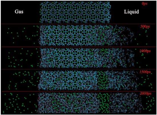 The hydrate slab has been divided into seven layers that are perpendicular to the Z-direction, so as to study different dissociation behavior for regions of hydrate-bearing sediments in contact with various phases in the seawater environment. The configuration shown in Figure 4 is used to discuss the effect of the two adjacent phase states. Layer A1, A2, and A3 near the liquid phase correspond to the liquid side, while the adjacent three layers near the gas phase correspond to the gas side. Symbol “L” and “G” are used to represent the liquid and gas side, respectively. Although the subsequent decomposition process will weaken the phase difference of the two side, the initial adjacent phase of hydrates will still affect their decomposition behavior.