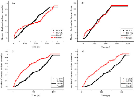 For more insight regarding the dissociation behavior of both phases, we showed the release rate of CH4 molecules. Figure 5 demonstrates the number of CH4 molecules that were released from liquid and gas side at different simulation temperature. There are 108 CH4 molecules on the gas side and 112 CH4 molecules on the liquid side (neglecting the total number of CH4 molecules in the partial cages). Only CH4 molecules that are in closed cages are counted to avoid the effect of quickly methane diffusion in partial cages. The established correlation relates to the number of released CH4 molecules and the hydrate dissociation progress, the slope of these curves represents the release rate. When one curve reached the final plateau, the corresponding side of the hydrate slab dissociated completely. To get a clear observation of the dissociation rate, the Levenberg-Marquardt method is used to fit the growth part of these curves (Figure 5).