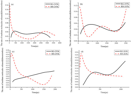 The rate changes of CH4 molecules released from liquid and gas side in different simulation temperature. (a) in 243 K, (b) in 247 K, (c) in 253 K, (d) in 263 K.