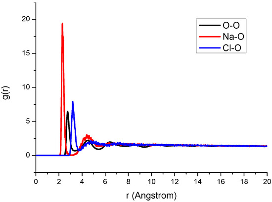 Radial distribution functions for Na+, Cl−, and oxygen atom.