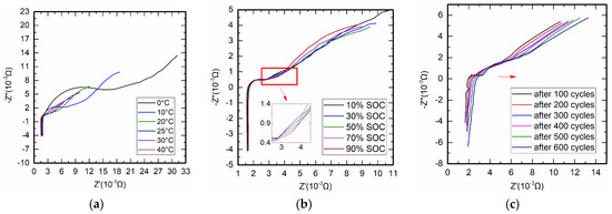 Figure 3 shows the battery impedance spectra at different states. The changing temperature has a significant effect on the electrochemical reaction rate and the ion diffusion process [36] leading to an obvious change to the impedance spectra as is shown in Figure 3a. The arcs of the spectra are enlarged as the temperature falls down. SOC has an insignificant effect on the impedance spectra, especially in the high frequency range. A second arc with much bigger radius appears when SOC decreases from 90% to 10% in Figure 3b. The ohmic resistance of the battery, corresponding to the intersection on the real axis, moves a little as the temperature and SOC changes. However, the aging process has mainly increased the ohmic resistance of the battery and the impedance spectra shift rightwards with little shape deformation as is shown in Figure 3c.