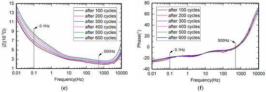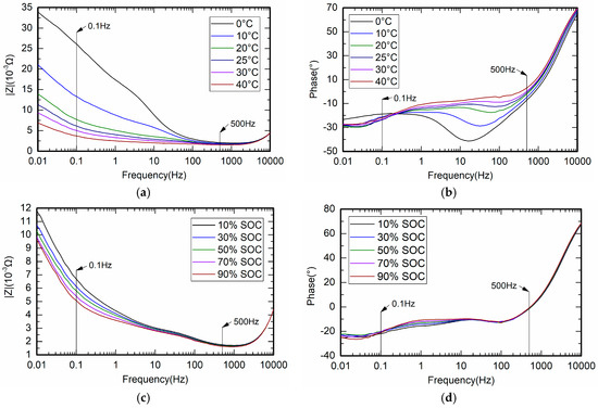 In order to determine the valuable frequency range as the battery state changes, the Bode plots are shown in Figure 4 corresponding to the electrochemical spectra in Figure 3. It is indicated that the impedance modulus in the low frequency range varies with the temperature, SOC and the aging state in Figure 4a–e obviously. To estimate the state with the impedance, the low frequency impedance may be measured. However, it will take much time to measure the low frequency impedance without more information as the spectrum section in the low frequency range is almost a straight line. On the other hand, the impedance in a very high frequency range becomes inductive, which does not match the characteristics of the battery. To cover the change of the ohmic resistance, the frequency, here 500 Hz, when the spectrum crosses the real axis is selected as the maximum frequency. And the valuable frequency range for the 8 Ah LiFePO4 battery is finally focused to 0.1 Hz to 500 Hz.