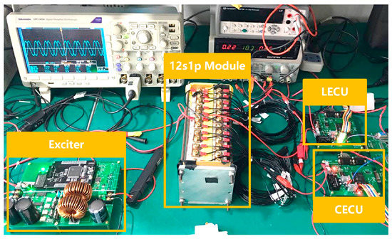 The experimental system is shown in Figure 5. A battery module with six battery cells connected in series are used. The voltage of the battery module is 15 V~22.2 V with the corresponding voltage from 0% SOC to 100% SOC. A designed DC-AC converter based on full bridge injects the sinusoidal current into the battery module. The current is measured by the CECU and the response voltage is measured by the LECU. Then the sampled excitation current is transmitted from the CECU to LECU via CAN bus. And the impedance of the battery cells is calculated in the LECU.