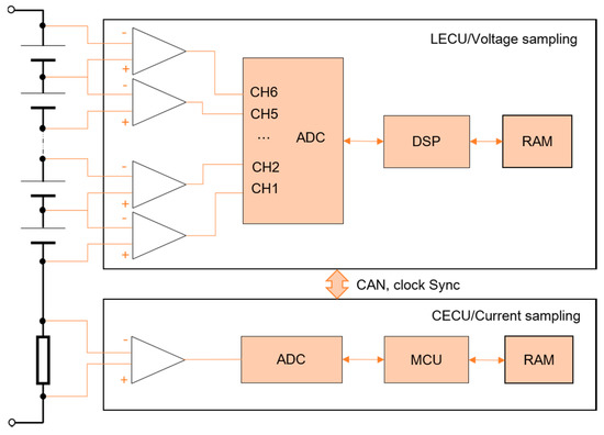 In the signal acquisition units, differential amplifiers (Texas Instruments, Dallas, TX, USA) are used to measure the voltage of the battery cells satisfying the high common voltage in the application. The output of the amplifiers is connected to a bipolar eight-channel Analog-to-Digital (AD) converter with 18 bits resolution, AD7608 (Analog Devices, Norwood, MA, USA). The results of the AD converter are measured by a digital signal processor, TMS320F2812 (Texas Instruments, Dallas, TX, USA). The LECU is powered by the battery module with six battery cells connected in series. In the CECU, the excitation current is measured with 0.01 Ω shunt (Yunkai Microelectronics, Shenzhen, China). The main circuits of the LECU and CECU are shown in Figure 6.