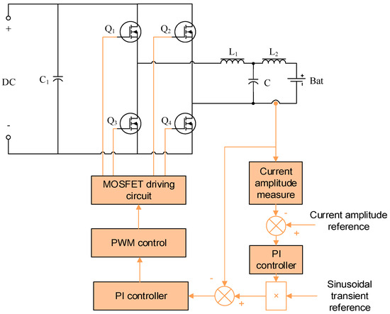 For the DC-AC converter, a designed LCL low pass filter is used to filter out the harmonic in the output of the full bridge composed of Q1, Q2, Q3 and Q4. Considering the 1500 mA excitation current, Metal-oxide-semiconductor field effect transistors (MOSFETs, (Infineon, Neubiberg, Germany)) are chosen as the power switches. A Proportional-Integral (PI) controller called the amplitude controller controls the current amplitude. The current amplitude is multiplied with the given sinusoidal instantaneous value. Then the modified sinusoidal instantaneous value is compared with the instantaneous output current. Another PI controller called the waveform controller integrates the comparing error and generate the duty cycle of four PWM signals driving the MOSFETs. Then, the output current of the DC-AC converter is controlled as the given sinusoidal reference with a specific amplitude. The compound control method in Figure 7 controls the DC-AC converter to generate AC current from 0.1 Hz to 500 Hz with the amplitude of 1500 mA.