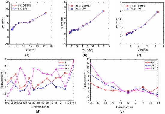 Battery cells’ impedance measured and measurement error with the designed impedance measuring system at 5 °C, 25 °C, 35 °C. (a–c) Comparison of measured impedance spectra with designed impedance measuring system (OBIMS) and electrochemical workstation (EW); (d) Relative error of measured impedance modulus at different temperature; (e) Relative error of measured impedance phase at different temperature.