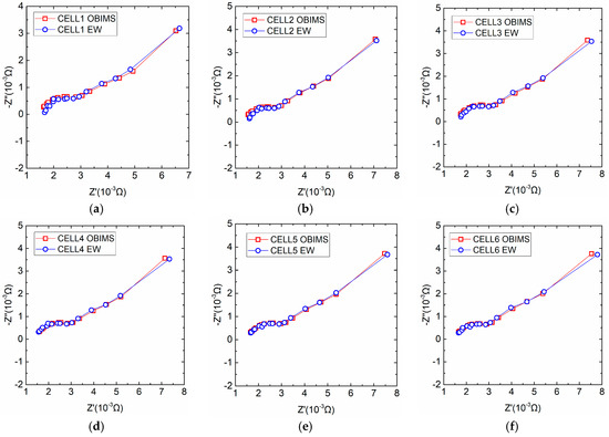 It can be seen that the relative impedance modulus of different battery cells is around 1, indicating a good consistence between the different battery cells. The change trends of the relative impedance modulus and phase measured with the prototype are almost the same as the ‘real’ trends obtained with electrochemical workstation. The tracking error of the relative impedance is much smaller than the absolute error measured, especially for the impedance phase shift. It should be noted that there are abnormal data points at 100 Hz, which are due to interference from the AC power supply to the electrochemical workstation. The effects can be seen more clearly in Bode and Nyquist plots in Figure 4.