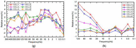 Battery cells’ impedance measured and measurement error with the designed impedance measuring system at room temperature (about 25 °C). (a–f) Measured impedance spectra of different battery cells; (g) Relative error of measured impedance modulus; (h) Relative error of measured impedance phase.