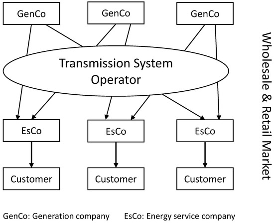 The key to open innovation in the power sector has been believed to be the development of consumer-centric business models and well-designed demand side management (DSM) programs [12,13]. Following these ideas, the recent work in [14] looks even further forward to more subtle modeling of customer behavior, with considerations of their willingness to participate and even emotional or irrational features. With these prevailing ideas in the research community, the next-generation retail electricity market infrastructure will be a level playing field, where all energy end-users and customers have equal opportunity to play the role of active participants rather than pure passive price-takers [15,16]. Fortunately, the recent development of the functionalities of the energy service companies (EsCos) and the distribution system operator (DSO) has opened many new possibility for monitoring, coordinating and controlling short-term or real-time delivery of electricity at the distribution level [17]. Especially with the further development of the concept of the DSO, deregulation of the electricity market has been spreading out from wholesale market design into retail market design, as shown in Figure 1 and Figure 2. In the new paradigm for energy transactions, different customers or customer groups (e.g., energy communities) are free to choose their service provider, either a distribution company or utility company, including even pure energy retailers, periodically.