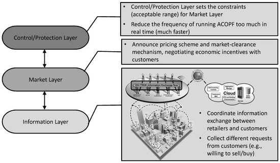 As a result of the distribution grid’s increasing number of roles and functionalities, the deployment of a DSO is becoming a necessity to ensure efficient and reliable delivery of electricity to emerging proactive customers. Customers now have more willingness to control their energy use and transactions with the utility grid, as their energy preferences have evolved. In parallel, there is a potential need for an intermediate entity between the regional transmission operators (RTOs) or independent system operators (ISOs) and energy end-users due to the limited visibility and control over the meter resources (e.g., advanced metering infrastructure) at the customer side [26]. A DSO in the future energy system and energy market design may be considered the evolution of a distribution management system, with, however, more functionality at different layers (Figure 3).