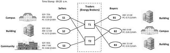 In this framework, as shown in Figure 4, an important new role, named the energy broker (EB) and working as a middleman or trader in this localized retail electricity market, is introduced to get buyers and sellers together, serving as a solution to search friction [63]. Both the buyers and sellers who would like to participate in this local energy market will provide bid/offer information of price-quantity pairs (price (PC) and amount (AM) in Figure 4) in each open time interval. The trader itself will also choose to maximize transaction efficiency or revenue with consideration for search cost in each open market time interval accordingly. The index of historical credit for energy transactions, sellers’ commitment probabilities (SCPs), is also proposed for power allocation of different trading peers. In this way, the proposed market structure can be modeled based on search theory and an optimal stopping problem (OSP) [62]. Some other similar works about this topic can also be found in [64,65].