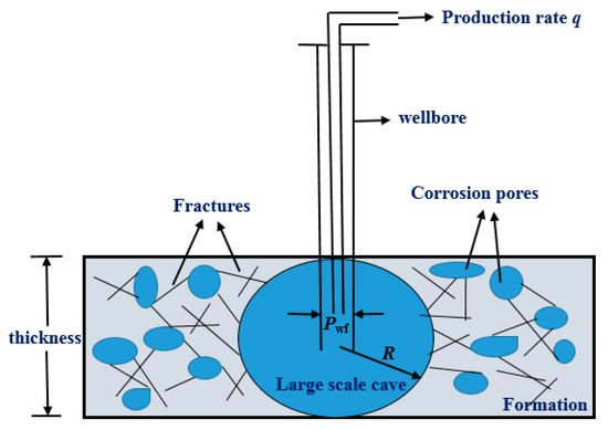 - large scale cave is in the center of circular formation, and the cave radius is R, with well drilling cave. Fractures are the main flow channel, the fluid flow into the cave through the fractures, and then through the oil well, the fluid of in large scale cave can be produced.