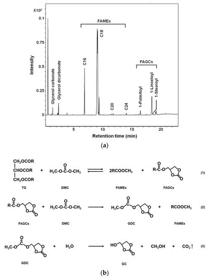 (a) Chromatogram for the FAMEs (transformer insulating oil) synthesized from soybean oil and DMC in the presence of Lipozyme 435. Reaction conditions: 0.874 g of soybean oil, 4.5:1 molar ratio of DMC to oil, 0.5 v/v % of water, 15 wt. % of Lipozyme 435 at 50 °C for 3 h. (b) Reaction pathway for transesterification with soybean oil and DMC. Triglyceride (TG); dimethyl carbonate (DMC); fatty acid methyl esters (FAMEs); fatty acid glycerol carbonate esters (FAGCs); glycerol dicarbonate (GDC); glycerol carbonate (GC).