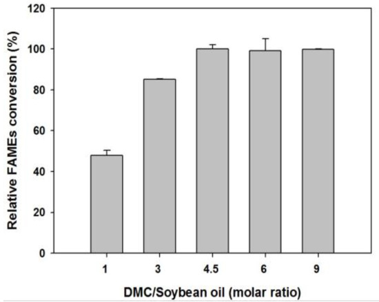 Effect of the DMC-to-soybean oil molar ratio on the reaction of transesterification. Reaction conditions: 0.874 g of soybean oil, different ratios of DMC, 0.2 v/v % of water, 5 wt. % of Lipozyme 435 at 50 °C for 3 h.