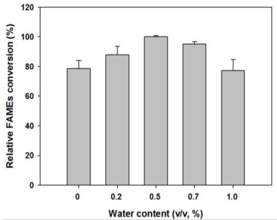 Effect of water content on the transesterification reaction. Reaction conditions: 0.874 g of soybean oil, 4.5:1 molar ratio of DMC to oil, 5 wt. % of Lipozyme 435 with different water additions at 50 °C for 3 h.
