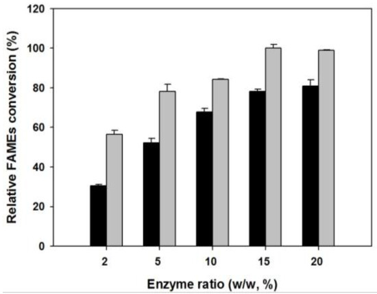 Effect of the enzyme-to-soybean oil weight ratio on the transesterification reaction. Reaction conditions: 0.874 g of soybean oil, 4.5:1 molar ratio of DMC to oil, 0.5 v/v % of water, with different enzyme-to-oil ratios at 50 °C for 3 h and 12 h. Symbols: 3 h (black bar), 12 h (gray bar).